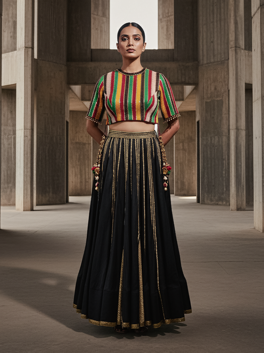 Our third section is a joyful immersion into the heart of Navratri, a tribute to the timeless, energetic spirit of Bandhani. This chapter celebrates one of Gujarat’s most iconic crafts, re-imagining its vibrant tie-dye patterns and intricate mirror work for the contemporary woman. Rich with the soul of Kutch embroidery and adorned with playful tassels and shells that dance with every movement, these creations are a pure expression of festive exuberance. It is a colourful, spirited ode to the nights of celebration.